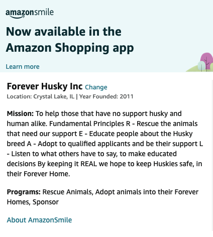 Head over to https://smile.amazon.com, select Forever Husky as your Support Charity.Â
